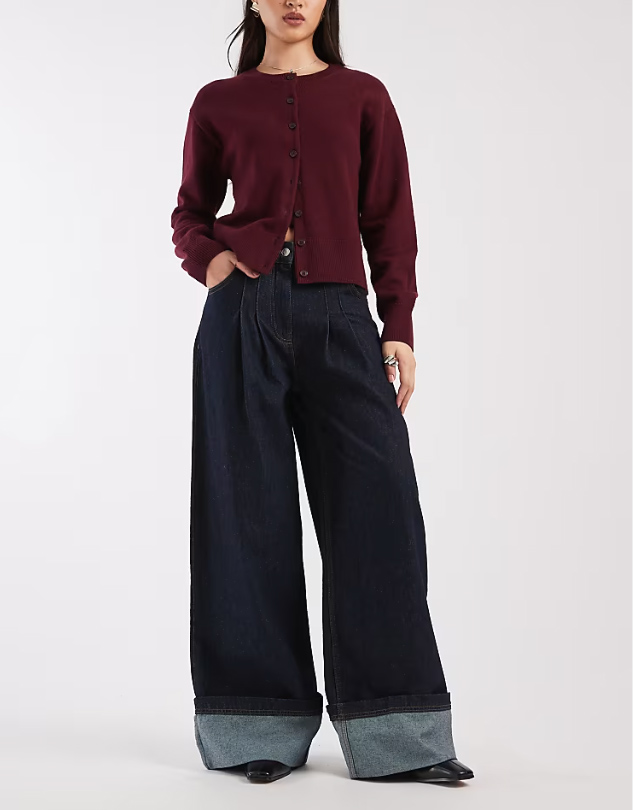 Dámske rifle širokého strihu s faldami elegantnej tmavoindigovej farby so širokým vyloženým spodným lemom, fukčnými vreckami sú štýlovým modelom, ktorý zaujme na prvý pohľad.