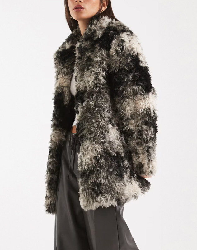 Dámsky šedý chlpatý kožuch krátkeho strihu so zvieracou potlačou, golierom a gombíkovou légiou je zajímavý model, ktorý oživí celý váš zimný look.